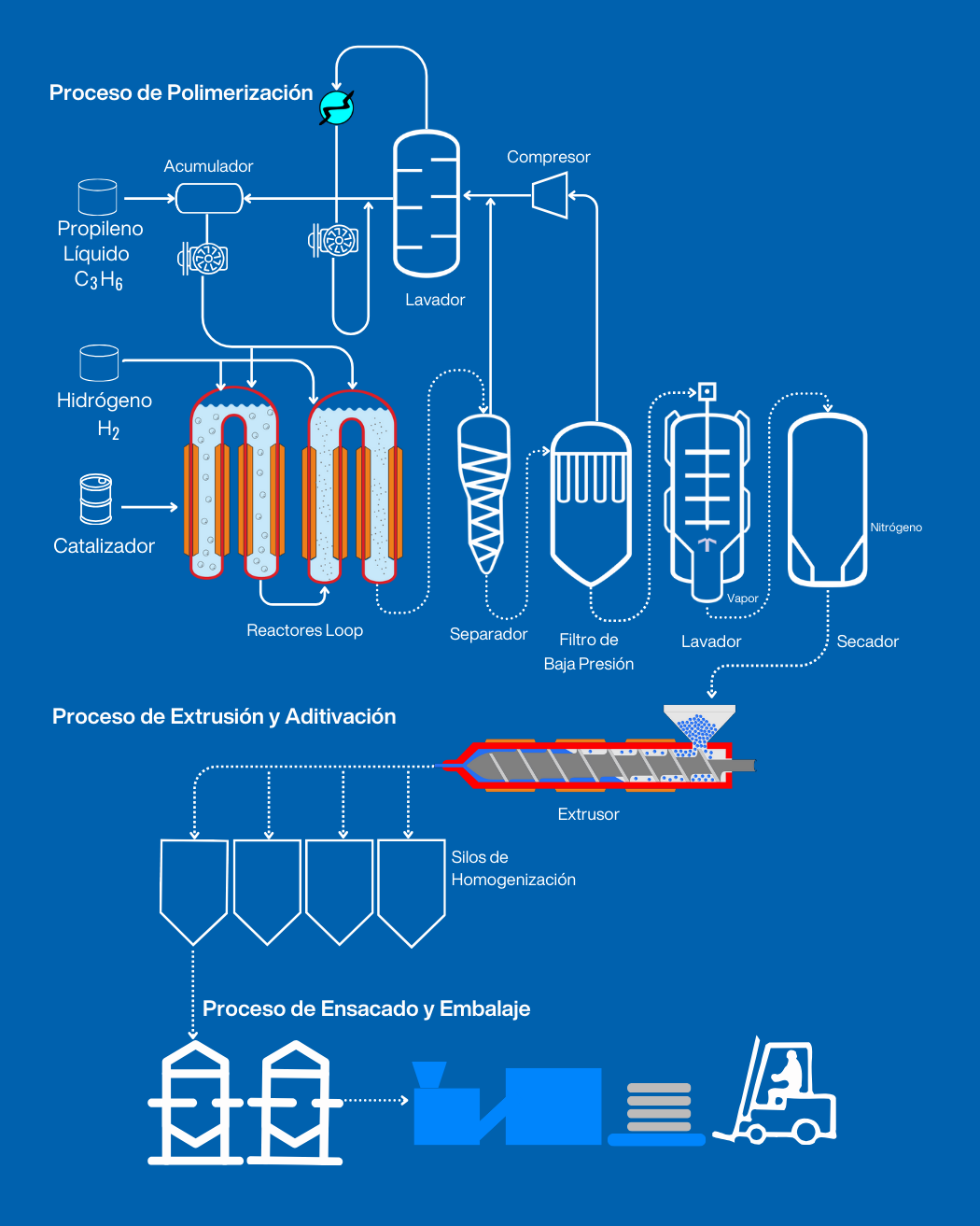 Una vez que se obtiene el polímero deseado de la reacción de polimerización (Reactores Loop), el producto es enviado a procesos de separación para el retiro de los residuos de propileno remanente y luego a un proceso de aditivación, donde se incorporan los aditivos necesarios para darle al producto características específicas de procesabilidad de acuerdo con lo que será su aplicación final.